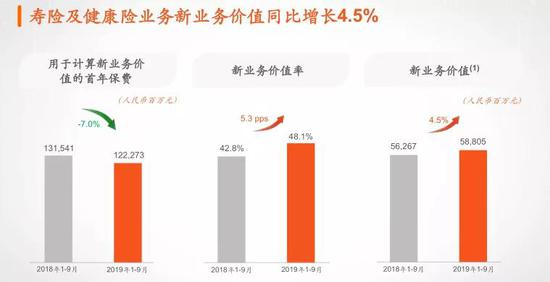 2019年前三季度,寿险及健康险业务实现营运利润691.04亿元,同比增长30.5%;新业务价值588.05亿元,同比增长4.5%,主要原因来自新业务价值率提升的贡献,新业务价值率同比上升5.3个百分点至48.1%。