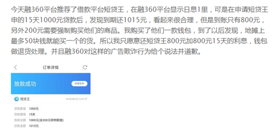 2018年7月后,借款人在投诉短贷王暴力催收的同时指出该产品通过强制溢价购买商品的方式收取砍头息,另有多位投诉人提到自己是经过融360平台的推荐被导流至短贷王。