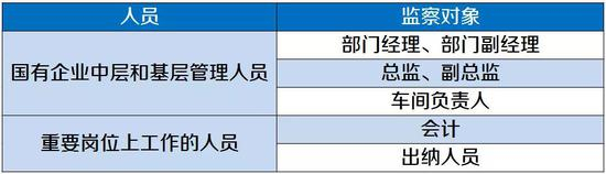 作为监察对象的国有企业管理人员,主要是国有独资企业、国有控股企业(含国有独资金融企业和国有控股金融企业)及其分支机构的领导班子成员,包括设董事会的企业中由国有股权代表出任的董事长、副董事长、董事,总经理、副总经理,党委书记、副书记、纪委书记,工会主席等;未设董事会的企业的总经理(总裁)、副总经理(副总裁),党委书记、副书记、纪委书记,工会主席等。