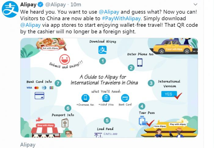 11月6日,蚂蚁金服旗下支付宝(Alipay)在其twitter账号发布消息,外国游客入境中国内地,可使用外国手机号注册并选择使用支付宝国际版,在内地使用二维码支付、消费或旅游。在90天内,访华旅客可充值使用2000元支付额度。