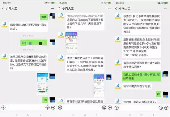 因为小编忽略了短信提示,大概10分钟之后,向上花方面打来电话提示,推荐的贷款渠道不合规,利率都很高,基本都是借2500元,还4000元,期限是6天,请关注微信公众号“小向人工”继续申请借钱。