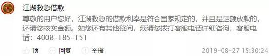 针对李女士投诉,聚投诉“江湖救急借款”账号回复称,借款利率符合国家规定,并且是足额放款,还请您核实金额,如您还有其他问题,请致电客服咨询。