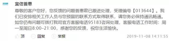 对此,聚投诉“宜信普惠”账号回复称,您反馈的问题普惠君已跟进处理,受理编号【013644】。我们已安排工作人员与您预留的联系方式取得联系,请务必保持通讯畅通。
