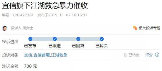2019年11月7日,周女士在聚投诉发帖称,宜信旗下江湖救急暴力催收。
