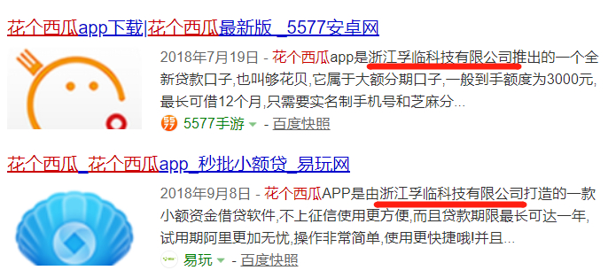 承谦科技旗下同样拥有疑为现金贷业务的商标”花个西瓜“。在一些软件推荐、现金贷“口子”推荐的网页中,“花个西瓜”app更是被直接描述为由孚临科技推出,还有介绍称其“也叫够花贝”。
