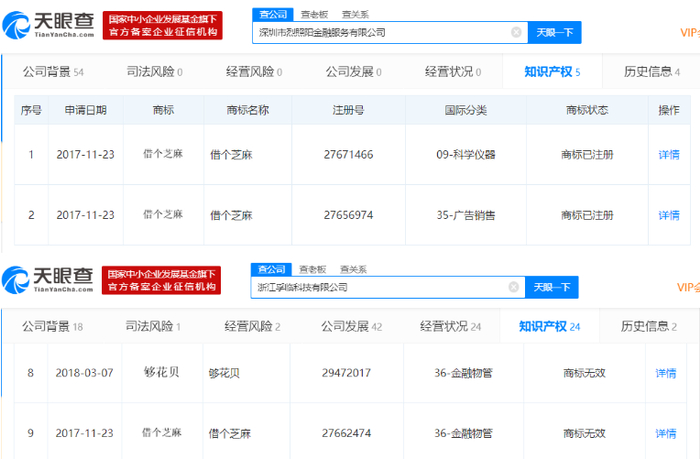 天眼查信息显示,烈照阳金服关联商标中同样出现“借个芝麻”。巧合的是,烈照阳金服“借个芝麻”商标申请日期与孚临科技为同一天。目前烈照阳金服关联的“借个芝麻”显示“商标已注册”,而孚临科技关联的“借个芝麻”显示“商标无效。此外,孚临科技关联的另一个无效商标”够花贝“也出现在了烈照阳金服软件著作权名单中。