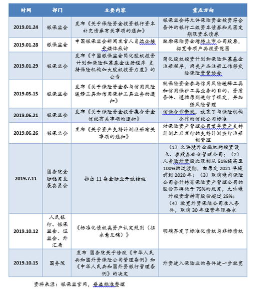 总体而言,2019年的监管政策倾向于放松保险资金投资限制,加大对于保险资金资产负债管理,防范系统性金融风险,以及放开外资进入保险业的壁垒。