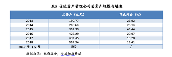 保险资管机构总资产在2013年以后快速增长,从2013年末190.77亿元增长到2019年5月底的560亿元。