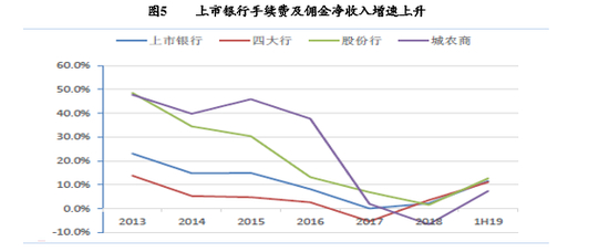 截至2019年上半年,上市银行手续费及佣金收入增速为11.6%,较17年和18年明显上升,各类型银行手续费及佣金净收入均有恢复性增长。