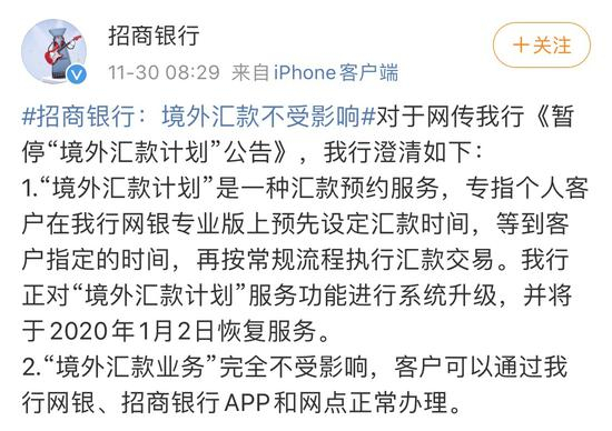 新浪财经讯,11月30日消息,对于网传招行《暂停“境外汇款计划”公告》,招商银行官方微博30日一早进行了相关回应。
