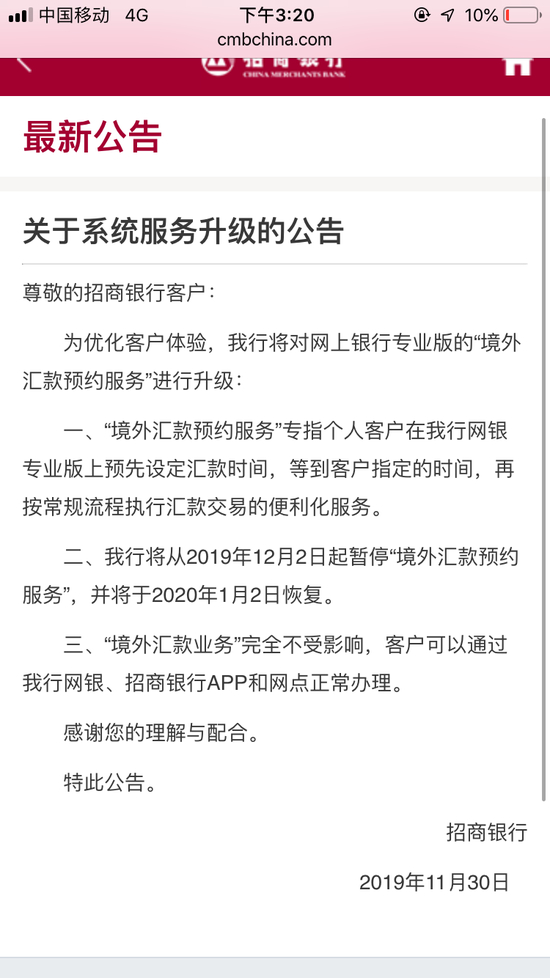 据了解,一则关于招商银行暂停“境外汇款计划”服务的公告11月29日在网络流传。公告显示,因系统升级改造,招行将对网上银行专业版“境外汇款计划”服务做如下调整:一、2019年12月2日起不再接受新的汇款计划指令。二、2019年12月30日起关闭汇款计划服务,所有未执行的指令将会失效,服务恢复时间将另行通知。
