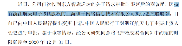 但在今年11月航天通信转让航天支付的进展公告中,因持有航天支付51%股权的伊千网络拟变更控股股东,目前已向中国人民银行提出变更申请。央行正在对航天支付主要出资人变更进行审批,鉴于该等情形,东方智旗接手航天支付49%股权的时限将延期至2020年12月31日。