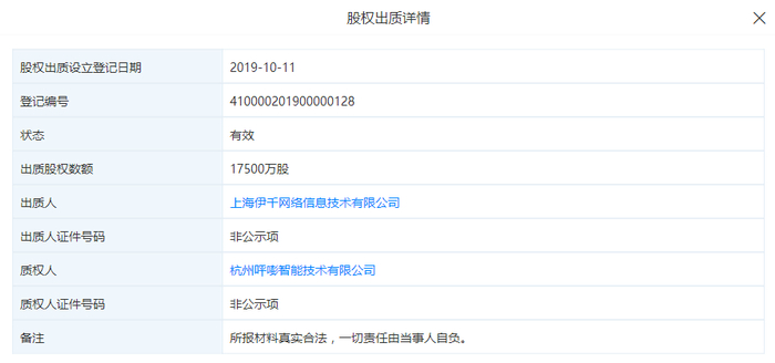 值得关注的是,伊千网络持有河南中原消费金融股份有限公司(下称“中原消费金融”)35%股份,投资金额为1.75亿元,为中原消费金融第二大股东。10月11日,伊千网络持有的中原消费金融1.75亿股也全部质押给了PingPong。