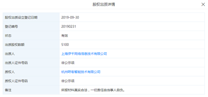 天眼查股权出质详情显示,目前伊千网络持有的51%航天支付股权被出质给杭州呯嘭智能技术有限公司,该公司运营跨境支付平台PingPong,股权出质设立登记的日期为9月30日,出质股权数额5100股,出质人为伊千网络,质权人为杭州呯嘭智能技术有限公司。