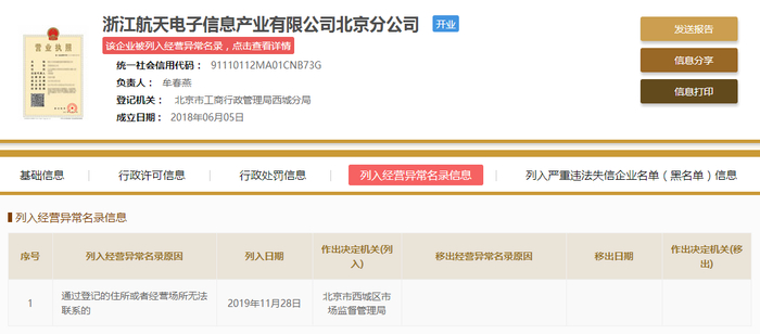 不仅是航天支付总公司,蓝鲸财经从国家企业信用信息公示系统获悉,浙江航天电子信息产业有限公司北京分公司也在11月28日,因通过登记的住所或者经营场所无法联系被北京市西城区市场监督管理局列为经营异常,至今仍未移出。