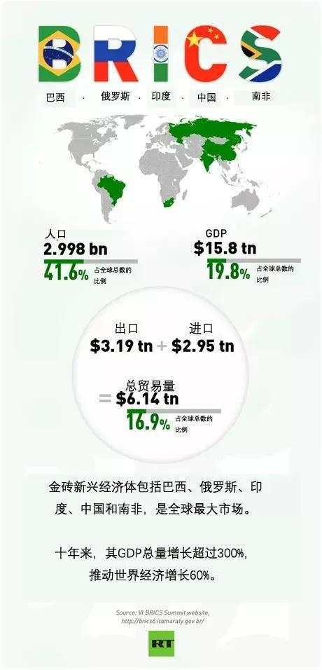 既然是金砖银行自然是由“金砖五国”(BRICS)设立,俄罗斯(Russia)、中国(China)、巴西(Brazil)、印度(India)和南非(South Africa)的英文首字母排在一起为Brick,就是砖的意思,5个发展中国家发展动力强劲,因此被称为“金砖五国”。
