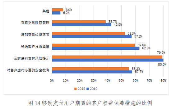 2019年,及时进行支付风险提示和畅通客户投诉渠道是用户最期望市场主体采取得保的移动支付安全和客户权益措施,分别占比为80.0%和62.8%;其次是对客户进行必要的安全教育和增加交易验证环节(如支付过程中输入手机收到的短信验证码等),分别占比为57.7%和57.2%;最后是采取交易限额管理和其他问题,占比分别为42.5%和6.2%。与2018年的调研情况比较可以发现,用户在移动支付安全和客户权益保护方面的需求有所提升,市场主体应进一步保障用户知情权,提高服务质量,完善电话、在线客服、邮箱等客户投诉渠道,不断加强对客户的安全教育,提升客户风险防范能力和水平。