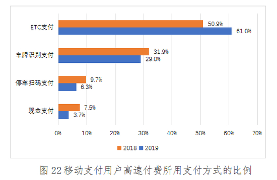 2019年,ETC支付是高速付费通行场景中移动支付用户最愿意使用的支付方式,占比为61.0%,较2018年增长9.1%;其次是车牌识别支付,占比为29.0%,较2018年下降2.9%;使用停车扫码支付和现金支付的用户占比分别为6.3%、3.7%,较2018年均有所下降。说明移动支付用户在通过高速收费站时,更倾向于使用减少排队时间、通行效率高、无需人工找零的无感支付模式。