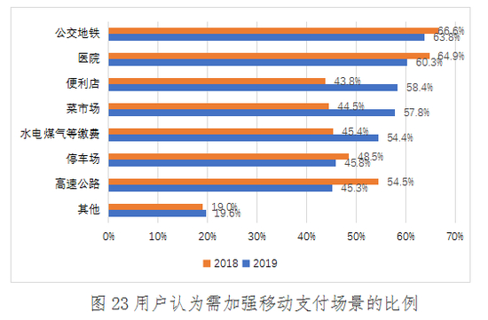 2019年,用户认为应加强移动支付应用场景排名第一的仍是公交地铁,占比为63.8%,与2018年持平;排名第二的是医院,占比为60.3%,较去年下降4.6%;排名第三的场景是便利店,占比为58.4%,较2018年增长14.6%;排名第四的场景是菜市场,占比为57.8%,较2018年增长13.3%;排名第五的是水电煤气等缴费,占比为54.4%,较2018年增长9%;最后是停车场和高速公路占比分别为45.8%和45.3%,较2018年均有所下降。上述数据显示,随着消费者对移动支付的接受程度进一步提高,用户在公交地铁、医院、便利店、菜市场和水电煤缴费等场景对移动支付的需求进一步增强。
