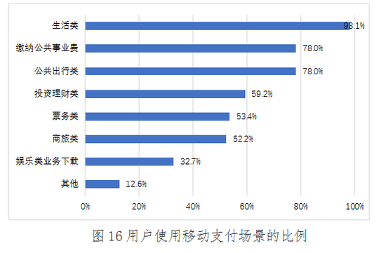 (一)移动支付与居民日常生活消费深度融合,购买生活品、缴纳公共事业费和公共出行支付的占比最高