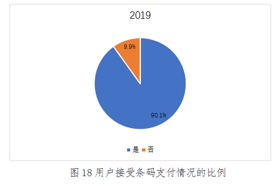 2019年,有90.1%的用户能够接受使用条码支付,有9.9%的用户选择了不接受,较2018年接受度略有上涨。说明经过市场主体的持续深耕市场和客户培育,条码支付的使用度和接受度进一步提升。