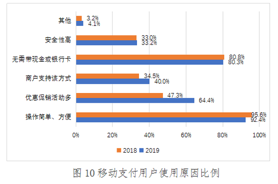 2019年,用户愿意使用移动支付的原因首要原因是操作简单、方便,占比为92.4%;选择无需带现金和银行卡的用户占比为80.3%,排名第二;其次是优惠促销活动多,占比为64.4%;商户支持该方式和安全性高基本相同,分别占比40.0%和33.2%。除此之外,有4.1%的用户选择移动支付的原因为其他。与2018年的调查结果比较可以发现,操作简单、无需携带现金或银行卡已成为消费者对移动支付的共识,较多的促销活动和更广泛的商户支持对用户选择移动支付的影响日益重要。