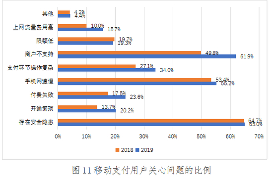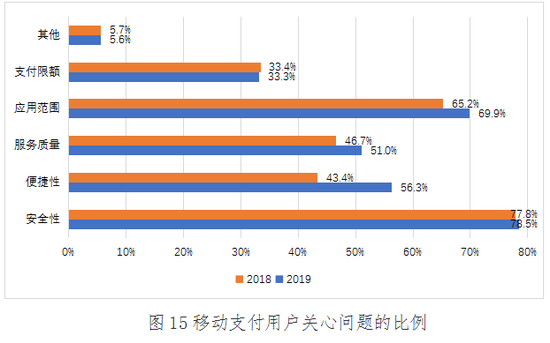 2019年,存在安全隐患和商户不支持是移动支付用户最担心的问题,分别占比为65.0%和61.9%;排名第三位的是手机网速慢,占比为55.2%;排名第四位的是支付环节操作复杂,占比为34.0%;付费失败和开通繁琐的占比分别为23.6%和20.2%;担心限额低的用户占比为19.3%;用户比较不担心的问题是上网流量费用高和其他,占比分别为15.7%和4.4%。这说明经过监管部门、行业协会和市场主体的持续宣传引导和用户的自主学习,用户对移动支付安全的重视程度持续加强。经过商业银行、支付机构和通讯服务提供商等机构的不断建设和努力,移动支付应用场景和受理环境建设进一步完善,用户的移动支付需求进一步被激发,并养成移动支付使用习惯,对商户支持形成刚性需求。