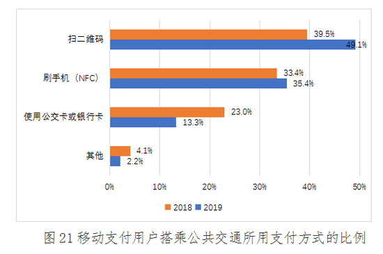 2019年,用户乘坐地铁等公共交通出行时最常用的移动支付方式是扫二维码,占比为49.1%,较2018年增长9.6%;其次是刷手机(NFC)支付,占比为35.4%,与2018年持平;使用公交卡或银行卡的用户占比排名第三,占比为13.35%,较2018年下降近10个百分点。说明随着公交行业受理环境的改善,移动支付正逐步取代公交卡等传统支付方式成为用户的新首选。