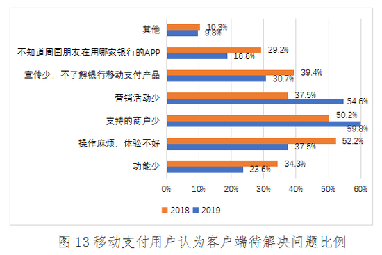 2019年,支持商户少和营销活动少是用户使用银行客户端进行支付时存在最多的问题,分别占比59.8%和54.6%;其次是操作麻烦、体验不好和宣传少、不了解银行支付产品,分别占比37.5%和30.7%;最后是功能少和不知道周围朋友都在用哪家银行的APP,分别是23.6%和18.8%。与2018年相比支持商户少和营销活动少的问题占比有所增长,银行需要加强受理环境建设,丰富客户端营销活动,增加用户粘性,满足用户对移动支付的刚性需求,提升移动支付用户对银行客户端的需求水平。
