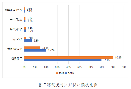 2019年,有69.6%的用户每天使用移动支付;每周使用3次以上移动支付的用户占比为19.7%;有6.8%的用户每周使用1-3次移动支付;半个月使用一次移动支付的用户占比为1.7%;一个月使用一次移动支付的用户占比为1.3%;半年及以上使用一次移动支付的用户不足1%。这说明移动支付已成为消费者日常使用的主要支付方式。