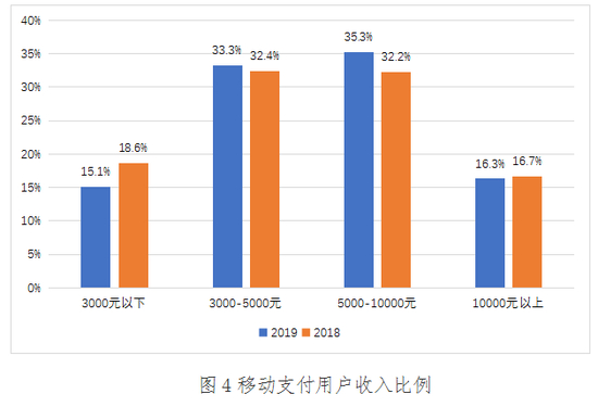 2019年,月收入在5000-10000元的移动支付用户最多,占比为35.3%;月收入在3000-5000元区间的移动用户排名第二,占比为33.3%;月收入在10000元以上和3000元以下的用户分别占比为16.3%和15.1%。与2018年相比,月收入在5000-10000元区间的移动支付用户比例略有上升,其他收入区间的用户比例与去年持平。
