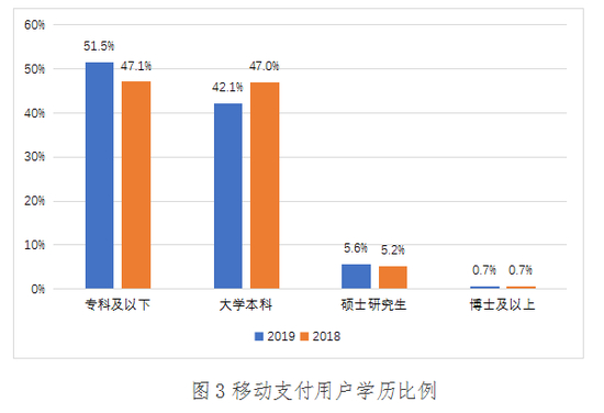 2019年,移动支付用户中拥有专科及以下学历的用户占比排名第一,占比51.5%;学历为大学本科的用户占比排名第二,为42.1%;硕士研究生和博士及以上高学历用户分别占比为5.6%和0.7%。与2018年相比,专科及以下学历用户的占比有所上升,仍是移动支付的主要使用群体,硕士研究生用户有略微上涨。