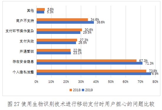 与2018年调查结果一致,用户在使用生物识别技术进行移动支付身份识别和交易验证时,首要担心的问题仍是个人隐私泄露和存在安全隐患,占比分别为76.9%和71.3%;除此之外,支付失败、支付环节操作复杂等问题的占比均有所下降,占比分别为26.5%和29.5%;但认为商户不支持、开通繁琐的用户比例略有上升,占比分别为38.6和23.1%。与2018年相比,生物识别技术在应用于移动支付可能造成的个人隐私泄露和安全隐患仍是用户最关心的问题,相关方应加强对客户敏感信息的保护,防范信息外泄或被非法使用。