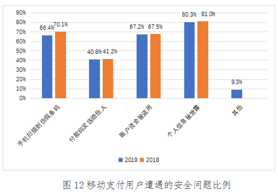 2019年,用户认为在支付过程中遇到的安全问题排名第一位是个人信息被泄露,占比为80.3%;排名第二位是账户资金被盗用,占比为67.2%;排名第三位是手机扫描到伪假条码,占比为66.4%;第四位是付款码发送给他人占比为40.8%,最后是其他占比为9.3%。与2018年相比,担心手机扫描到伪假条码的用户比例增长近4个百分点,担心其他问题的用户比例与去年持平。说明移动支付用户在关注账户资金安全的同时,也十分注重个人信息安全的保护。市场主体应将客户信息保护纳入风险管理体系,建立健全客户信息保护制度、机制、流程,加强敏感信息的保护,构建覆盖客户信息全生命周期的保护体系。