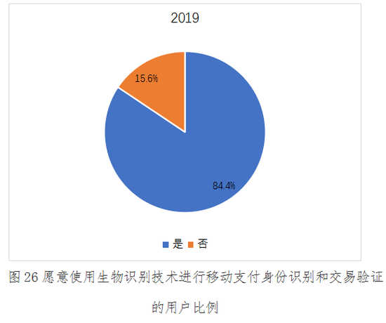 2019年,有84.4%的用户能够接受使用生物识别技术来进行移动支付身份识别和交易验证,有15.6%的用户选择了不接受,与2018年持平。这说明生物识别技术作为移动支付身份识别和交易验证的手段已经过多年使用,在移动支付用户中的接受程度趋于稳定。
