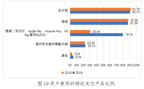 2019年,用户最常使用的移动支付产品是支付宝、微信和银联云闪付(含Apple Pay、Huawei Pay、Mi Pay等手机闪付产品),占比分别为90.7%、87.3%和79.7%;使用银联云闪付的比例显著提升,较去年提升近50个百分点;使用商业银行手机银行等客户端的占比为23.1%,与2018年基本持平;还有5.0%的用户使用其他移动支付产品。