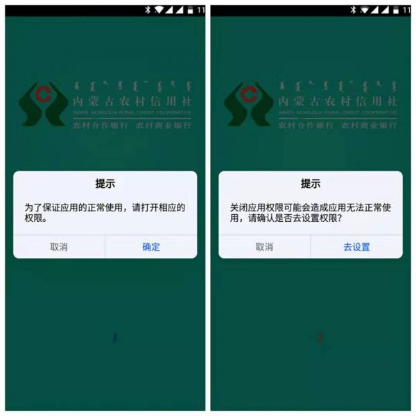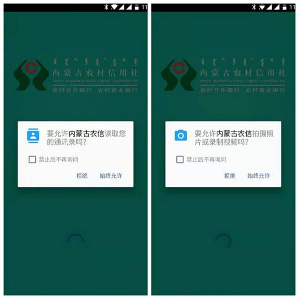 记者测试发现,规模较小的区域银行的APP在申请用户权限、隐私政策申明方面,普遍存在不完善、不详尽的问题。以内蒙古农信APP为例,下载安装后,初次登陆即要求用户授权定位、视频照相、通讯录信息等,但并未说明具体用途,且如果用户拒绝,将发生闪退,无法使用这款APP。