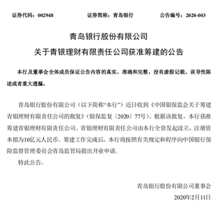 根据公告,青银理财有限责任公司由青岛银行全资发起设立,注册资本拟为10亿元。青岛银行表示,筹建工作完成后,该行将按照有关规定和程序向银保监会青岛监管局提出开业申请。