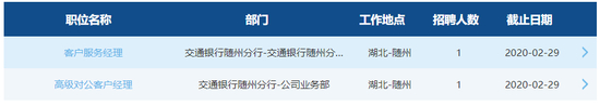 与此同时,交通银行的春季社招工作也在进行。2月18日,记者在交通银行官网看到,该行总行及多个省级分行均有待招职位放出。其中,在此次疫情严重的湖北省,交通银行随州分行拟招聘1名客户服务经理及1名高级对公客户经理。