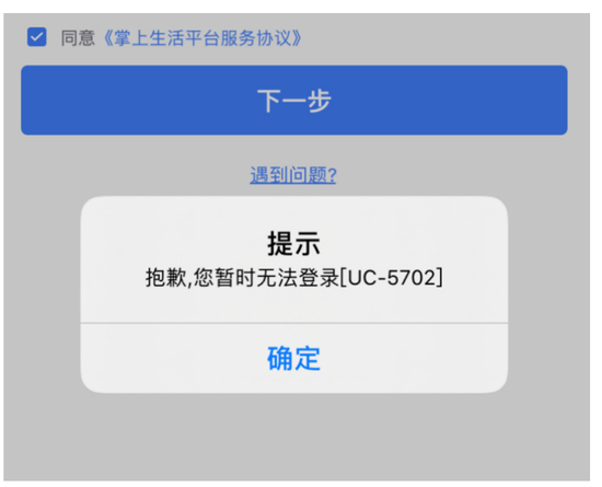 然而,近日黑猫投诉平台却收到了多起针对掌上生活APP的投诉。投诉人表示,自己的掌上生活APP无法登陆,只是因为换了手机、切换了账号或者切换了网络环境。这些用户登录时会被系统提示 “抱歉,您暂时无法登陆[UC-5702]”。