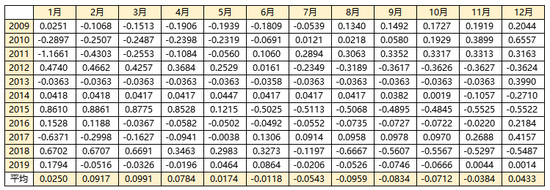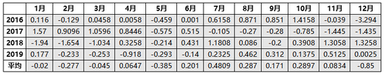 图5与图2逻辑类似,为当月价格与当年平均价格轧差进行的比较。由于债券价格与利率成反比,因此数值越高代表利率越低。结论是:最近四年通过国债期货所映射出的平均市场利率从低到高的顺序依次是7月、10月、8月、6月、9月、11月、4月、1月、3月、2月、5月、12月。