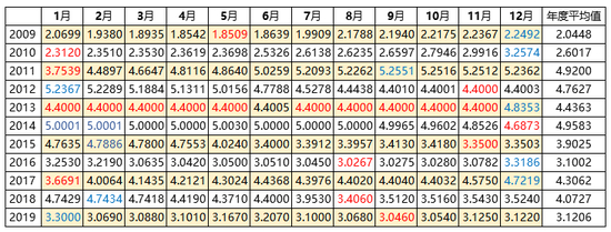 图1为次贷危机之后从2009年到2019年共11年的Shibor数值,为了和LPR规则保持一致,其中每个月的数值,均采用当月20日(节假日顺延,下同)的1年期Shibor数据。图中标红的数据为当年最低利率,标蓝的部分为当年最高利率。