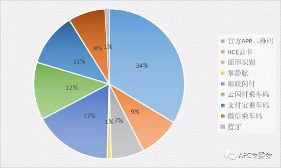 所有过闸技术中,App二维码乘车占比达到了34%,占比最高;银联闪付占比达到了17%,位列第二。但在此图显示中,并未将所有二维码以及NFC技术分别集合在一起,因此从技术角度判断占比率意义不大。