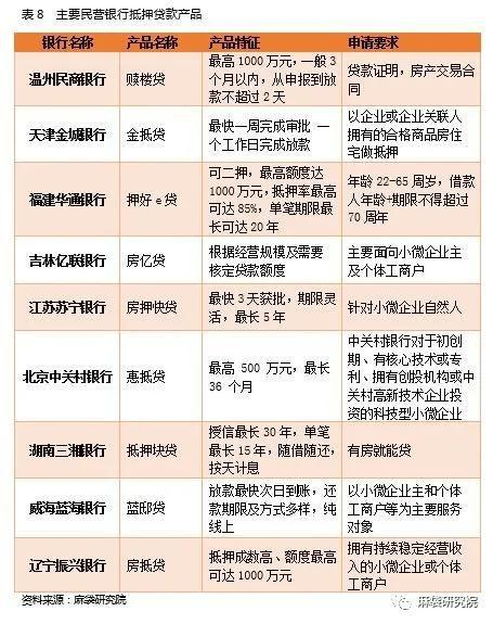 针对小微企业及企业主的抵押贷款,抵押物通常为房产,包括厂房、商业用房、个人住房等。相较前述信贷而言,抵押贷款额度大、期限长,更受民营银行青睐,如下表所示: