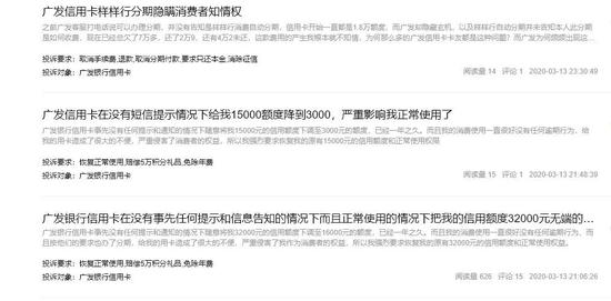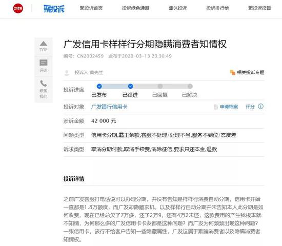 3月13日,在聚投诉平台上,有用户投诉“广发信用卡样样行分期隐瞒消费者知情权”,称该行在没有经过持卡人同意的情况下,私自开通“样样行”消费分期业务,导致欠款是越还越多,本来1.8万额度,现在已经总欠了7万多,还了2万9,还有4万2未还。另外,在该投诉平台上,关于广发银行信用卡分期、催收的帖子还有很多。