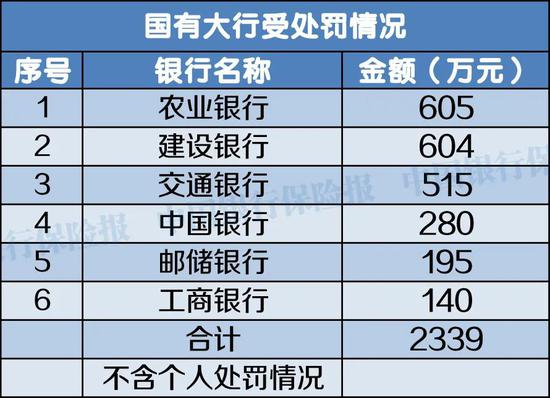 农业银行、建设银行和交通银行以605万元、604万元和515万元的罚款排在国有大行前三。