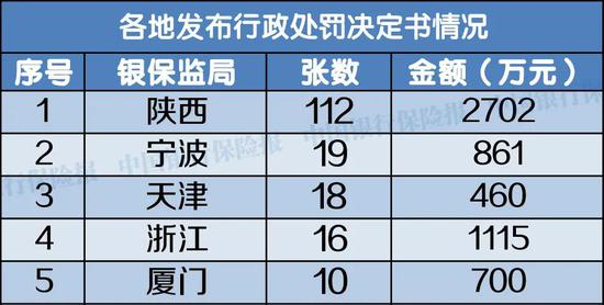 在银保监局方面,陕西以112张行政处罚决定书排在第一,宁波、天津以19张、18张排在第二三位。陕西以2702万元的罚款排在第一,浙江、宁波以1115万元、861万元排在第二三位。