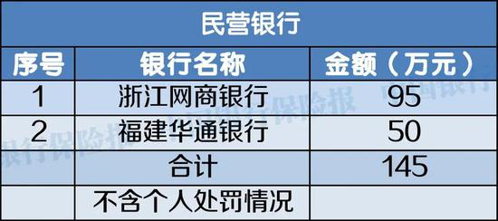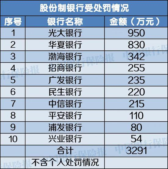 光大银行、华夏银行和渤海银行以950万元、830万元和342万元的罚款排在股份制银行前三。
