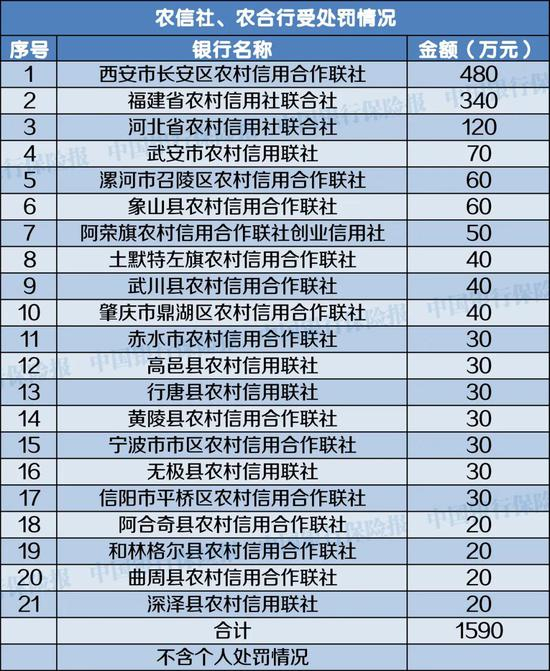 西安市长安区农村信用合作联社、福建省农村信用社联合社和河北省农村信用社联合社以480万元、340万元和120万元的罚款排在农信社前三。