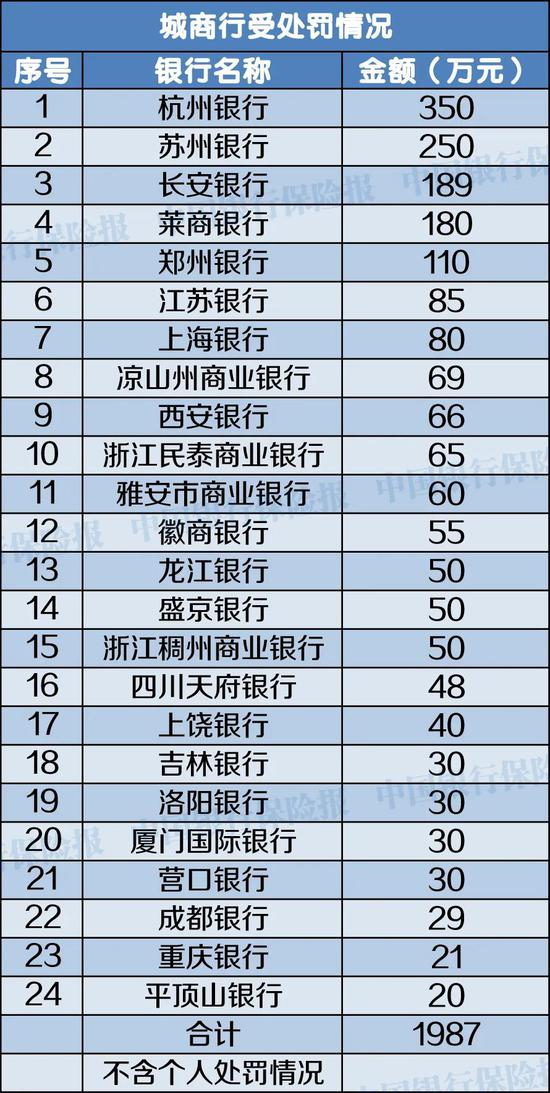 杭州银行、苏州银行和长安银行以350万元、250万元和189万元的罚款排在城商行前三。